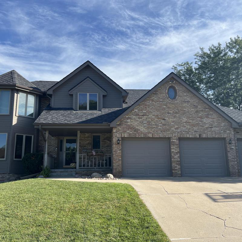 Hometown Roofing completed a hail damage repair project in Bellevue, Nebraska. The crew removed old shingles and installed new Malarkey Vista class 4 architectural shingles. They added seamless aluminum gutters, replaced damaged vinyl windows and a garage door, and installed new ProVia vinyl siding. Downspouts were also upgraded to match the new exterior.